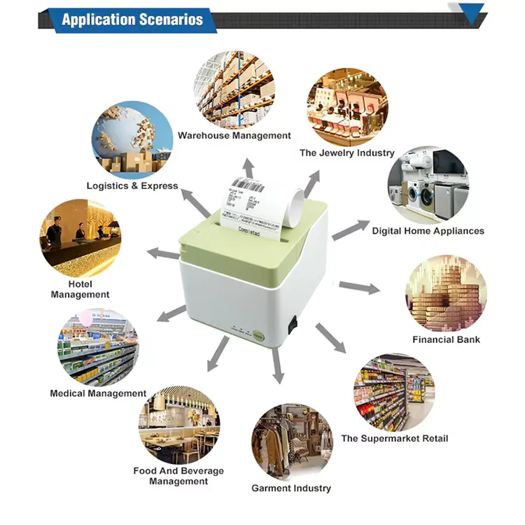 تبلغ سرعة الطباعة 250 مم/ثانية، مع عرض طباعة فعال يبلغ 72 مم أو 64 مم. وهو يدعم العديد من الرموز الشريطية، بما في ذلك UPC-A وEAN-13 وCODE39 وCODE128، مما يجعله مناسبًا لمختلف الصناعات مثل تقديم الطعام والمتاجر الكبرى ومحلات السوبر ماركت.